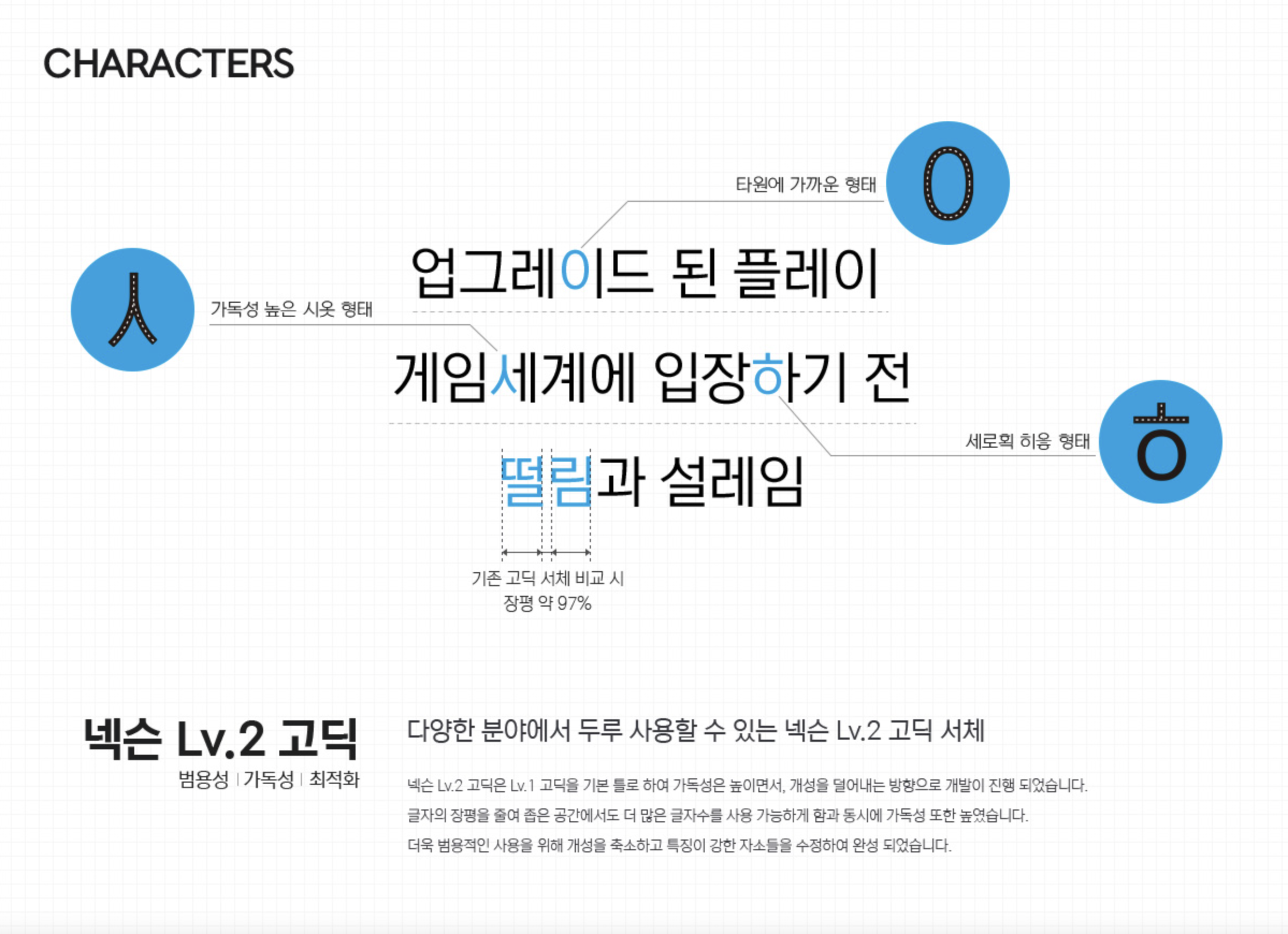 LEVEL UP의 첫 단계로 게임에서 경험했던 느낌을 서체에 담아 표현했습니다. 서체의 기능적인 부분 외에도 즐거운 경험들을 전달하고자 하는 또 다른 도전의 시작입니다.